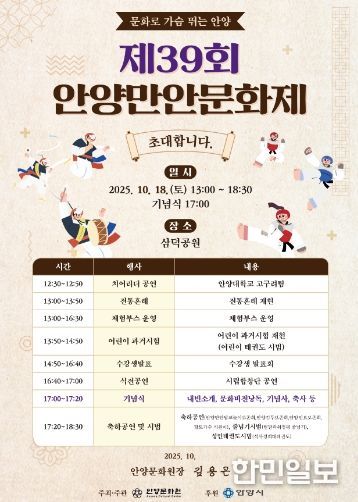17일 안양시에 따르면, 안양문화원이 주관하는 안양만안문화제는 1986년 시작된 안양 대표 지역문화 축제이다. 이 축제는 매년 10월 셋째 주 토요일인 ‘문화의 날’에 시민과 함께 안양의 문화적 정체성을 확인하고 지역 공동체의 정서를 이어가는 역할을 해왔다.
