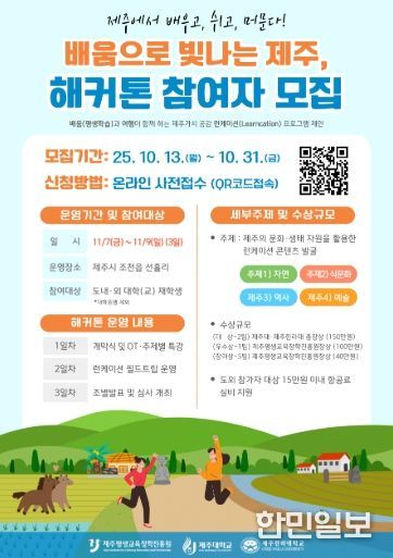 한민일보 서울포커스 임경복 기자 | 제주평생교육장학진흥원은 '제주가치 공감, 런케이션'사업의 일환으로 ‘배움으로 빛나는 제주, 해커톤’을 개최하며, 오는 10월 31일까지 참가자를 모집한다고 밝혔다.