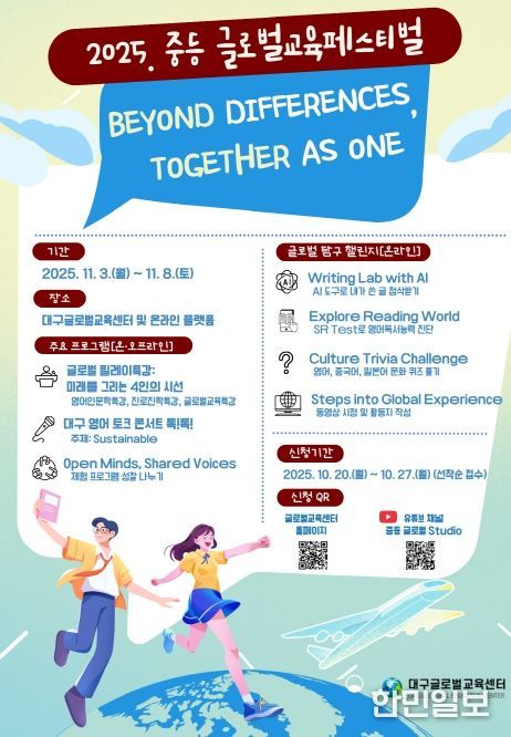 한민일보 서울포커스 임철현 기자 | 대구교육연수원 산하 대구글로벌교육센터는 11월 3일부터 8일까지 ‘Beyond Differences, Together as One(차이를 넘어, 하나로)’을 주제로 '2025 중등 글로벌교육페스티벌'을 개최한다.