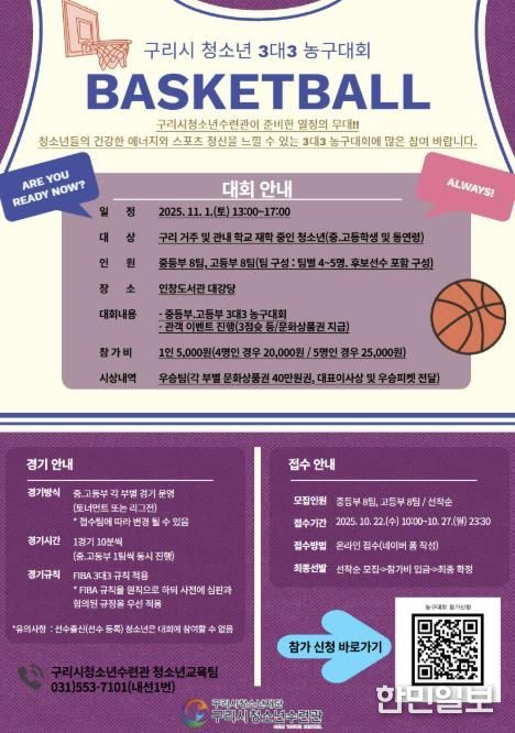한민일보 서울포커스 김정옥 기자 | 구리시청소년재단 청소년수련관은 '2025 구리시 청소년 3대3 농구대회' 참가 신청을 10월 22일부터 10월 27일까지 온라인으로 신청받는다고 밝혔다.