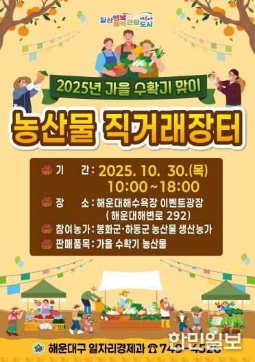 한민일보 서울포커스 임광현 기자 | 해운대구는 30일 오전 10시~오후 6시 해운대해수욕장 이벤트광장에서 ‘가을 수확기 맞이 농산물 직거래장터’를 연다.