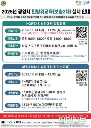 한민일보 서울포커스 임광현 기자 | 광양시는 10월부터 상반기 기본교육을 이수하지 않은 민방위 대원을 대상으로 ‘2025년 민방위 보충 2차 교육’을 실시한다고 밝혔다.