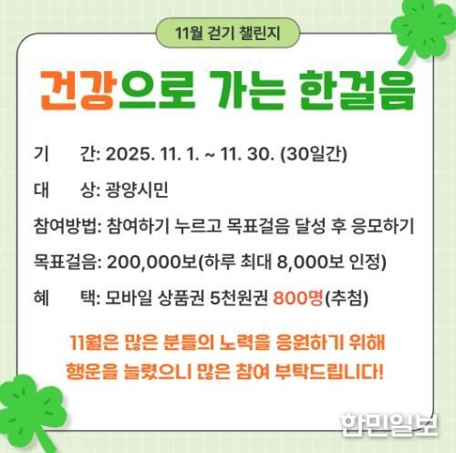 한민일보 서울포커스 임광현 기자 | 광양시는 지역 주민의 건강생활 실천을 돕기 위해 11월 1일부터 30일까지 모바일 걷기 앱 '워크온'에서 ‘건강으로 가는 한걸음 11월 걷기 챌린지’를 운영한다고 밝혔다.