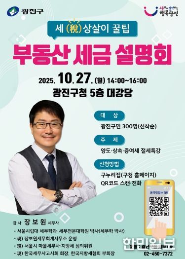 김경호 광진구청장은 “복잡한 부동산 세금에 대한 구민들의 궁금증을 해소하고, 실질적인 절세 정보를 제공할 수 있어 뜻깊다”라며 “앞으로도 구민이 세금으로부터 불이익을 받지 않도록 생활 속 세금정보를 쉽게 전달하는 열린 세무행정을 강화하겠다”고 말했다.