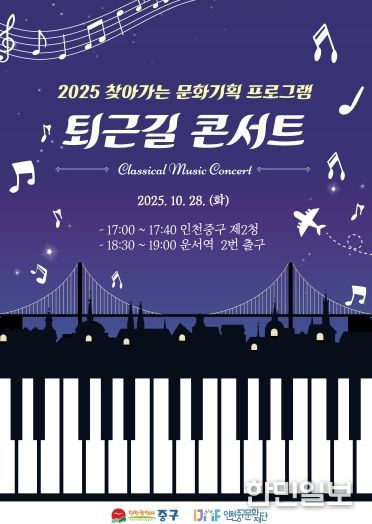 한민일보 서울포커스 백진욱 기자 | (재)인천중구문화재단(이사장 김정헌)은 오는 28일 저녁 퇴근길 시민들을 위한 특별한 문화 행사 ‘2025 영종 퇴근길 콘서트’를 개최한다.
