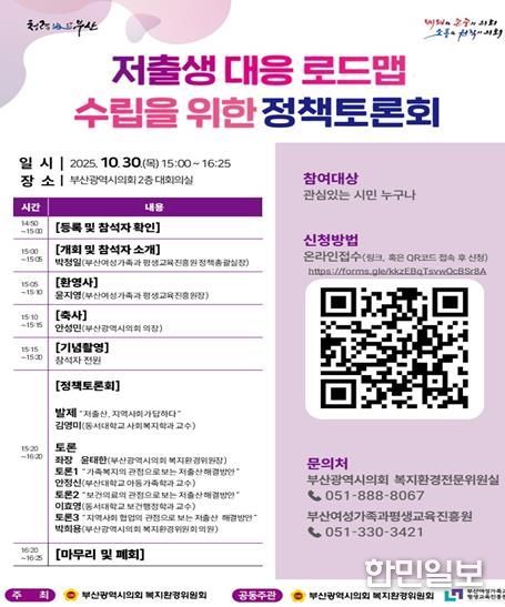 한민일보 서울포커스 임광현 기자 | 부산광역시의회 복지환경위원회 윤태한 위원장(사상구1, 국민의힘)은 2025년 10월 30일 15시 부산광역시의회 2층, 대회의실에서 ⌜저출생 대응 로드맵 수립을 위한 정책토론회⌟를 개최한다고 전했다.