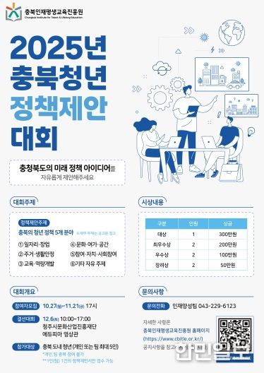 한민일보 서울포커스 임경복 기자 | 충북인재평생교육진흥원(원장 유태종)은 충청북도 청년의 시각에서 지역 현안을 해결하고 도정에 반영 가능한 정책 아이디어를 발굴하기 위한 ‘2025년 충북청년 정책제안 대회’ 참가자를 모집한다고 밝혔다.