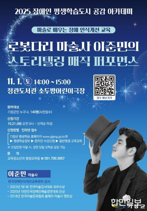 한민일보 서울포커스 임광현 기자 | 기장군은 오는 11월 1일 오후 2시 정관도서관 소두방어린이극장에서 장애인평생학습도시 공감 아카데미‘장애 인식개선 마술공연’을 개최한다고 31일 밝혔다.