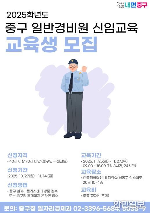 한민일보 서울포커스 김서윤 기자 | 서울 중구가 법정의무교육 이수부터 취업연계까지 원스톱으로 지원하는 실무 중심의 '일반경비원 신임교육 과정'을 무료로 운영한다.