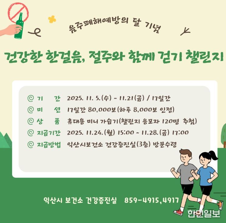 한민일보 서울포커스 김용택 기자 | 익산시 보건소는 '11월 음주폐해예방의 달'을 맞아 5일부터 '건강한 한 걸음! 절주와 함께 걷기 챌린지'를 추진한다.