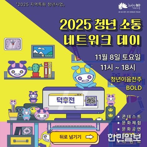 한민일보 서울포커스 김용택 기자 | 전주시는 오는 8일 오전 11시부터 오후 6시까지 청년이음전주(완산구 현무1길 31-5)에서 청년과 시민이 함께 어우러지는 ‘청년 소통 네트워크 데이’를 운영한다.