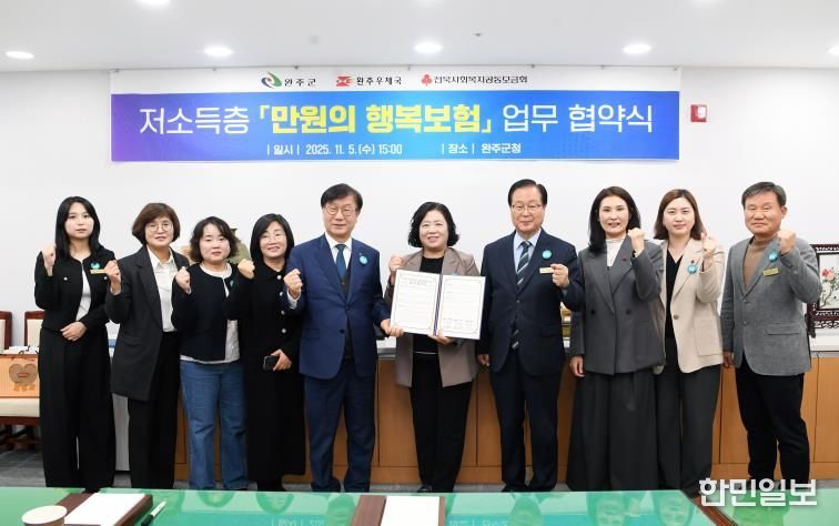 한민일보 서울포커스 박용남 기자 | 완주군이 관내 저소득층의 예기치 않은 재해·사고에 대비하기 위해 지역사회와 손잡고 ‘만 원의 행복보험’ 지원 업무협약을 체결했다.
