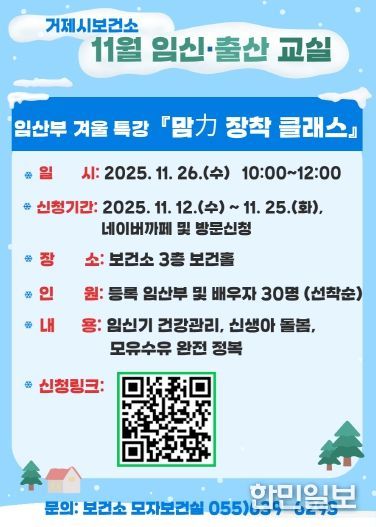 한민일보 서울포커스 김은금 기자 | 거제시보건소는 오는 11월 26일 오전 10시부터 12시까지 보건소 3층 보건홀에서 '맘力 장착 클래스' 겨울 특강을 개최한다. 지역 내 임산부와 배우자를 대상으로 하며, 11월 12일부터 네이버 카페 또는 모자보건실 방문을 통해 신청할 수 있다.