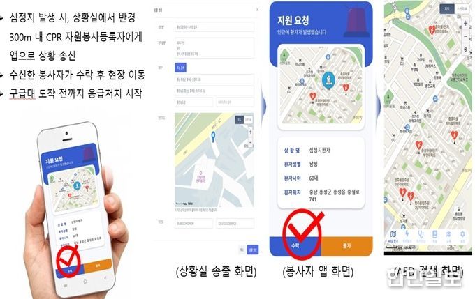심정지 신고가 접수되면 상황실에서 반경 300m 내 자원봉사 등록자에게 앱으로 상황을 송신하며, 자원봉사자는 요청에 대해 수락 또는 불가로 지원 여부를 선택할 수 있고 수락한 봉사자는 현장으로 이동해 구급대 도착 전까지 응급처치를 하는 방식이다.