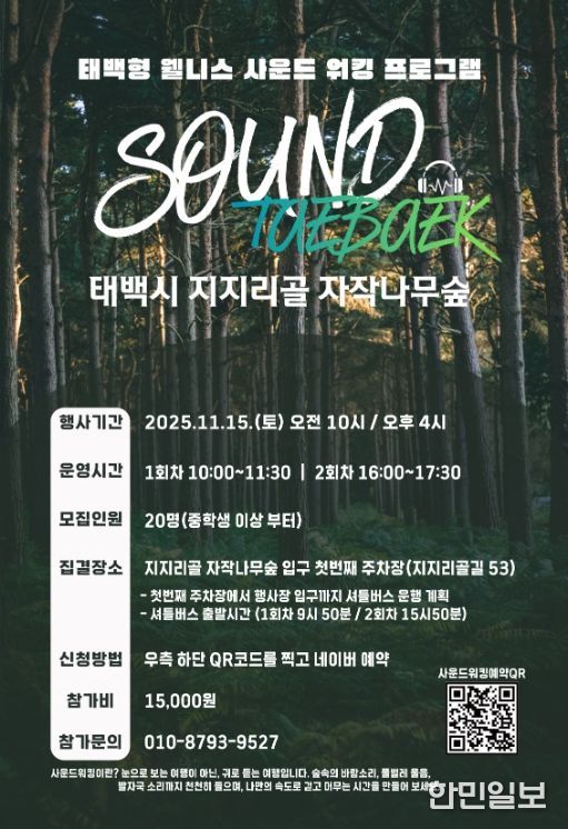 한민일보 서울포커스 임경복 기자 | 태백시는 오는 11월 15일과 16일, 태백의 대표 자연 명소인 지지리골 자작나무숲과 연화산 유원지 일원에서 ‘2025년 태백형 웰니스 사운드 워킹 프로그램’을 운영한다고 밝혔다.