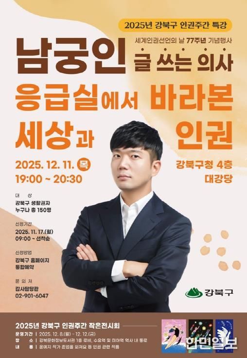 한민일보 서울포커스 김봉순 기자 | 서울 강북구는 오는 12월 11일 오후 7시, 강북구청 대강당에서 ‘2025년 세계인권선언의 날 기념 명사특강’을 개최한다고 밝혔다.