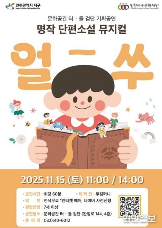인천서구문화재단은 11월 15일 오전 11시와 오후 2시, 문화공간 터·틀(검단)에서 첫 번째 기획공연인 국악뮤지컬 '얼쑤'를 선보인다.