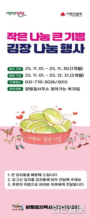 한편, 김장 나눔 참여를 희망하는 주민은 11월 1일부터 30일까지 양평읍 찾아가는 복지팀(☎ 031-770-3026, 3015)에 기부 신청할 수 있으며, 신청자에게는 김치통이 제공된다. 기부된 김치는 복지 대상자 중 꼭 필요한 가구를 선정해 전달될 예정이다.