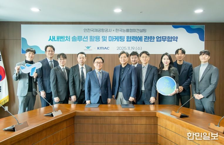 한민일보 서울포커스 유창렬 기자 | 인천국제공항공사(사장 이학재)는 19일 오전 공항청사 회의실에서 한국능률협회컨설팅(KMAC)과 ‘인천공항 사내벤처 솔루션* 활용 및 마케팅 협력을 위한 업무협약(MOU)’을 체결했다고 밝혔다.