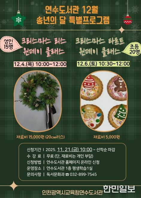 한민일보 서울포커스 유창렬 기자 | 인천광역시교육청연수도서관은 12월 4일부터 6일까지 지역 주민을 위한 ‘12월 송년의 달 특별프로그램’을 운영한다.