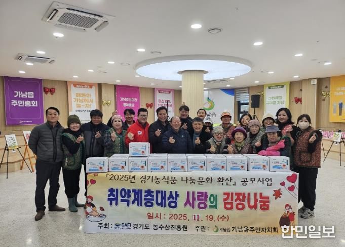 한민일보 서울포커스 전희주 기자 | 가남읍주민자치회는 11월 18일에서 19일 이틀간 가남읍 행복나눔센터 1층에서 ‘취약계층대상 사랑의 김장나눔’봉사를 개최했다. 이번 행사는 '2025년 경기농식품 나눔문화 확산' 공모사업의 일환으로 진행됐으며, 정성스럽게 담근 김장김치와 알타리김치를 관내 40개 마을의 홀몸어르신 80명에게 전달했다.