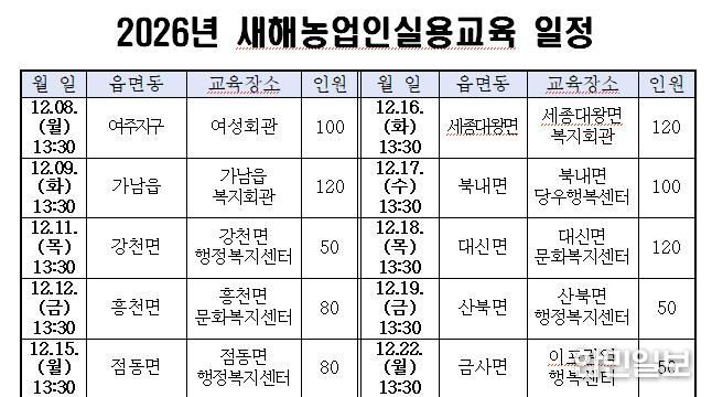 한민일보 서울포커스 전희주 기자 | 여주시는 오는 2025년 12월 8일부터 12월 22일까지 총 10회에 걸쳐 진행하는 녪년 새해농업인실용교육’을 추진한다고 밝혔다.
