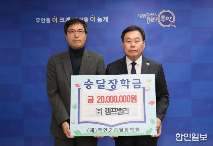 한민일보 서울포커스 박용남 기자 | 전남 무안군은 지난 20일 주식회사 캠프밸리에서 지역 인재 육성을 위해 (재)무안군승달장학회에 장학금 2천만 원을 기탁했다고 밝혔다.