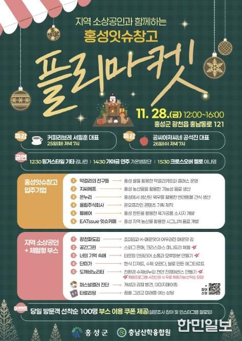 한민일보 서울포커스 유돈상 기자 | 홍성군은 오는 28일 홍성복합문화창업공간 ‘잇슈창고’에서 지역 청년 창업기업과 소상공인이 함께 하는 ‘홍성잇슈창고 플리마켓’을 개최한다고 밝혔다.