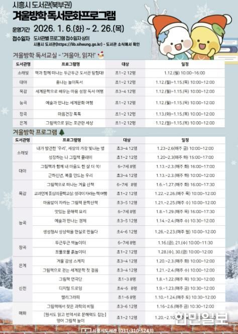 ‘겨울방학 프로그램’도 책을 기반으로 한 창의적이고 다양한 활동을 제공한다. 대표 프로그램으로는 ▲소래빛도서관 ‘내가 발견한 ‘우리’ 세상의 가장 빛나는 별’ ▲능곡도서관 ‘맛있는 문해력 요리’ ▲목감도서관 ‘그림책으로 떠나는 겨울 산책’ 등이 있으며, 아이들이 읽기 활동과 함께 창의·정서·문화 체험을 폭넓게 경험할 수 있도록 구성됐다.
