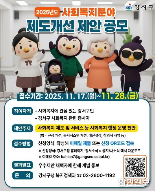 한민일보 서울포커스 전희주 기자 | 서울 강서구는 오는 28일까지 ‘2025년 사회복지분야 제도개선 제안 공모’를 진행한다고 밝혔다.