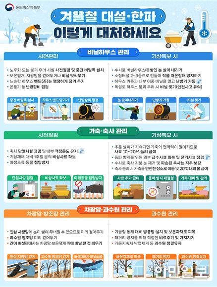 도는 겨울철 농업재해 상황실을 내년 3월15일까지 운영해 기상특보 전파, 피해 상황 파악, 응급복구 지원 등 종합 상황관리를 수행한다. 경보 발령 시에는 초동대응팀·재해복구팀·축산팀이 비상체체로 돌입해 24시간 대응체계를 유지한다. 시군·기상청·유관기관 등과의 공조체계를 통해 사전대응요령과 농업인 안전 등을 상시 홍보하고, 정보 공유를 강화한다.