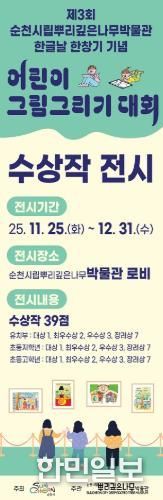 한민일보 서울포커스 임광현 기자 | 순천시는 오는 11월 25일부터 12월 31일까지 순천시립뿌리깊은나무박물관 상설전시실 로비에서 '제3회 순천시립뿌리깊은나무박물관 한글날 한창기 기념 어린이 그림그리기 대회 수상작 전시회'를 개최한다.