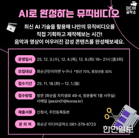 한민일보 서울포커스 박용남 기자 | 화순군은 오는 12월 3일부터 화순군민을 대상으로 화순군 청년센터(청춘들락) 미디어공작소에서 ‘AI로 완성하는 뮤직비디오 영상 제작하기’ 교육을 진행한다고 밝혔다.
