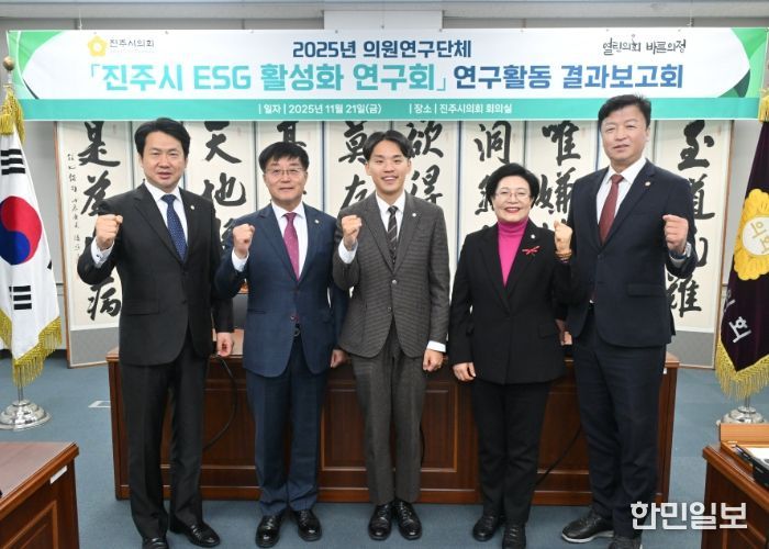 한민일보 서울포커스 김은금 기자 | 진주시의회 의원 연구단체 ‘진주시 ESG 활성화 연구회’는 21일 올해 연구활동을 마감하는 결과보고회를 열고, 연간 추진 성과와 향후 정책 제언을 공유했다고 밝혔다.