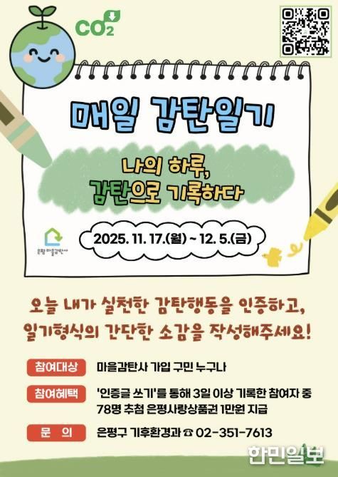 한민일보 서울포커스 임광현 기자 | 서울 은평구는 지난 17일부터 내달 5일까지 주민들이 일상 속에서 탄소중립 행동(감탄행동)을 실천하고 기록하며, 긍정적 경험과 친환경 실천을 연결하도록 돕는 ‘매일 감탄일기 – 나의 하루, 감탄으로 기록하다’ 프로그램을 진행한다고 밝혔다.