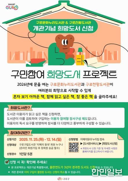 한민일보 서울포커스 진광성 기자 | 구로구가 오는 25일부터 다음 달 14일까지 내년 개관 예정인 구로문화누리도서관과 구로천왕도서관에서 ‘희망도서 프로젝트’를 추진한다고 밝혔다.