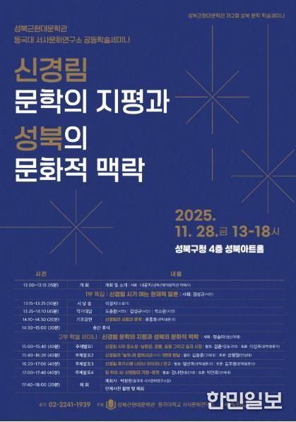이번 학술세미나는 성북구청 주최로 진행되며, 성북근현대문학관과 동국대 서사문화연구소가 주관한다. 문의는 성북근현대문학관로 하면 된다. 신경림 시인의 문학을 통해 인간과 지역, 공동체의 관계를 성찰하고, 그의 시 세계가 담고 있는 공동체적 시선과 성북의 문화적 맥락을 함께 탐구하는 장이 될 전망이다. 이승로 성북구청장은 “성북구의 문학적 전통과 문화적 정체성을 더욱 깊이 있게 나누는 계기가 될 것으로 보인다”고 말했다.