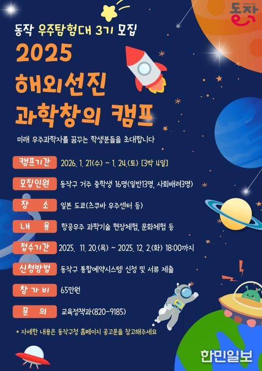참여를 희망하는 학생은 내달 2일 오후 6시까지 구청 누리집 통합예약시스템 ‘2025 해외선진 과학 창의 캠프-3기’에서 신청한 뒤, 담당자 전자우편으로 관련 서류를 제출하면 된다.