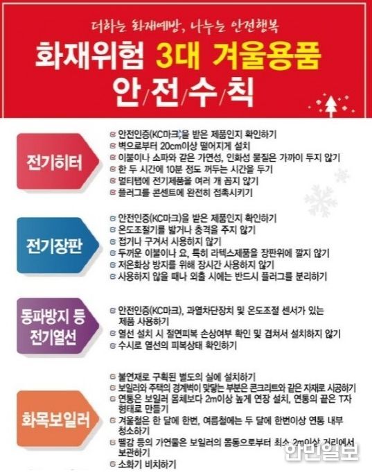 한민일보 서울포커스 유돈상 기자 | 홍성소방서는 본격적인 추위가 시작됨에 따라 난방기기 사용이 급증함에 있어 화재 위험이 높은 난방연료 취급에 대한 각별한 주의를 당부했다.