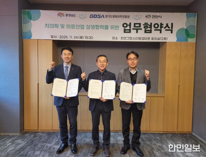 한민일보 서울포커스 황준형 기자 | 천안시는 충청남도, 경기도경제과학진흥원(GBSA)과 치의학 및 바이오 산업 전주기 협력체계 구축을 위한 업무협약을 체결했다고 24일 밝혔다.
