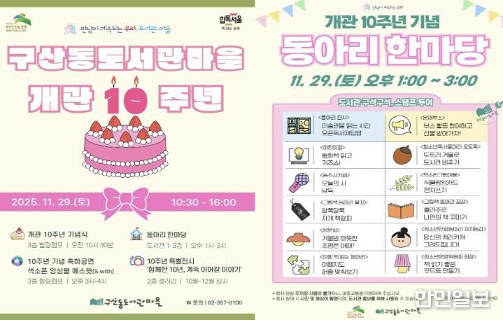 이순임 구산동도서관마을 관장은 “구민들의 서명운동으로 시작해 주민참여와 민·관 협치를 통해 탄생한 도서관이 어느덧 주민과 함께 성장한 10년이 됐다”며, “주민과 함께하는 이번 기념행사를 통해 앞으로의 10년도 구민들과 함께 그려가겠다”고 전했다.