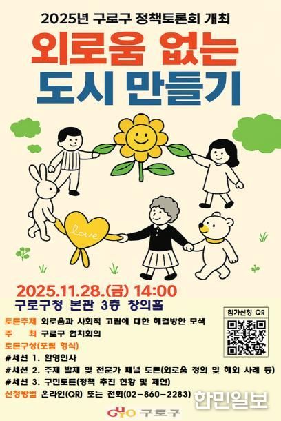 한민일보 서울포커스 진광성 기자 | 구로구가 오는 11월 28일 구청 본관 3층 창의홀에서 ‘외로움 없는 도시 만들기’를 주제로 정책토론회를 열고, 외로움과 사회적 고립 문제에 대한 대응 방안을 논의한다.