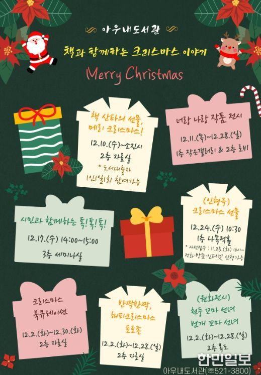 한민일보 서울포커스 황준형 기자 | 천안시 아우내도서관은 연말을 맞아 내달 다채로운 크리스마스 행사를 운영한다고 25일 밝혔다.