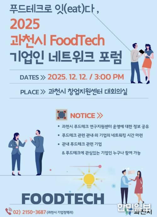 한민일보 서울포커스 최성훈 기자 | 과천시는 내달 12일 과천시 창업지원센터 대회의실에서 ‘과천시 푸드테크 기업인 네트워크 포럼’을 개최해 관내·외 푸드테크 기업인들이 참여하는 교류의 장을 연다고 25일 밝혔다.