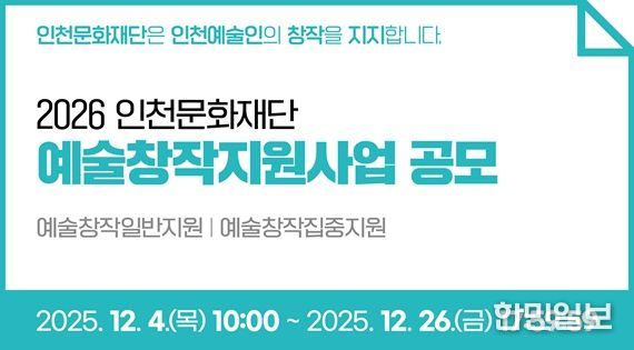한민일보 서울포커스 유창렬 기자 | 인천문화재단은 오는 12월 2026 예술창작지원사업 공모를 시작한다. 공모 분야는 예술창작일반지원, 예술창작집중지원으로 두 가지이다. 접수기간은 2025년 12월 4일부터 12월 26일까지이며, 국가문화예술지원시스템으로 온라인 신청을 받는다.