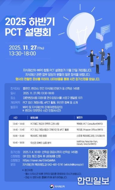 한민일보 서울포커스 임철현 기자 | 지식재산처는 세계지식재산기구(WIPO)와 공동으로 11월 27일 13시 30분 대한변리사회(서울시 서초구) 연수강당에서 2025년 하반기 특허협력조약* 국제출원 설명회를 개최한다. 이번 설명회는 특허협력조약 제도의 최신 개정 동향과 전략적 활용방안을 공유하기 위해 마련됐으며, WIPO 담당자들이 직접 참석해 대면 설명회를 진행한다.