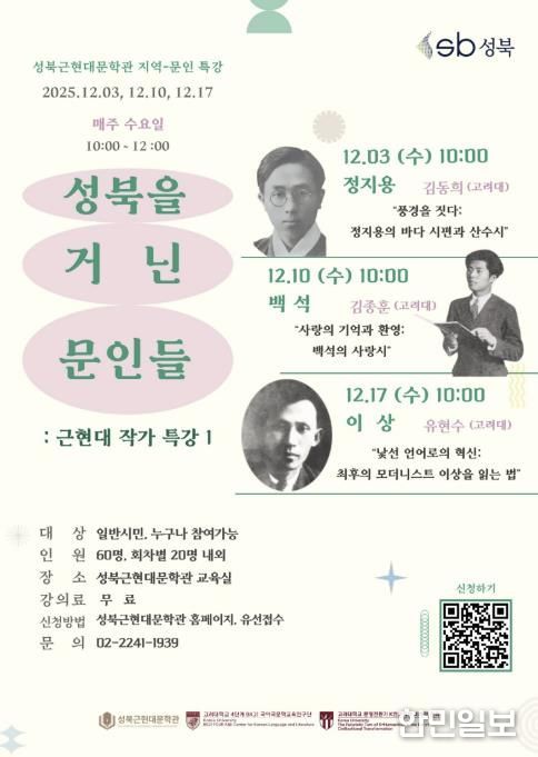 한민일보 서울포커스 김봉순 기자 | 성북구가 지역과 문학의 연계를 강화하고 시민들이 성북의 문학적 자산을 더욱 가까이 만나볼 수 있도록, 지역-문인 특강 '성북을 거닌 문인들 : 근현대 작가 특강'을 성북근현대문학관에서 개최한다.