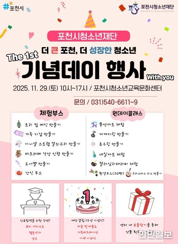 한민일보 서울포커스 심기옥 기자 | 포천시청소년재단은 재단 출범 1주년을 맞아 오는 29일 포천시청소년교육문화센터에서 ‘2025년 포천시청소년재단 1주년 기념행사 – 더 큰 포천, 더 성장한 청소년’을 개최한다.