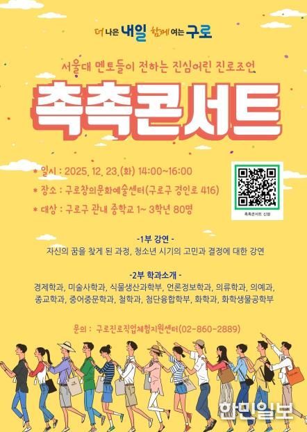 한민일보 서울포커스 진광성 기자 | 구로구가 관내 중학생들의 진로 탐색을 지원하기 위해 오는 23일 ‘서울대 멘토들이 전하는 진심어린 진로조언: 촉촉콘서트’를 개최한다고 밝혔다.