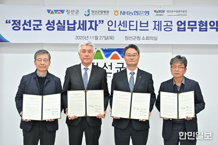 한민일보 서울포커스 진광성 기자 | 정선군은 11월 27일 군청 소회의실에서 성실한 납세 문화 정착과 군민의 납세 의식 제고를 위해 정선군립병원, NH농협은행 정선군지부, 정선군시설관리공단과‘정선군 성실납세자 지원 업무협약’을 체결했다.